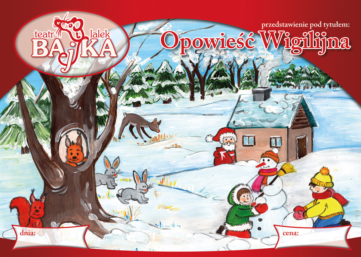 W przedstawieniu bierze udział 10 postaci: Myszka Franciszka, Duchy Bożonarodzeniowe, Sowa Agatka, Wilk Waldek, Miś Bartuś, Lis Lucjan, Żółw Leonardo, Święty Mikołaj.