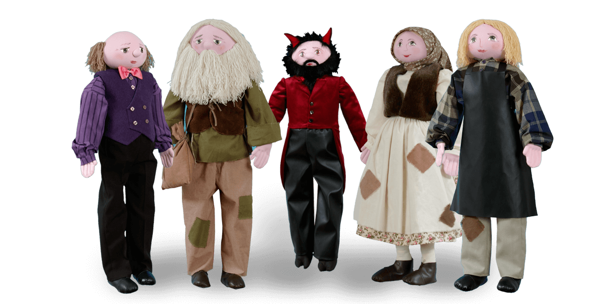 W przedstawieniu bierze udział 11 postaci: Szewc, Żona Szewca, Młynarz, Żona Młynarza, Posterunkowy, Biedny Wędrowiec, Sierota, Sprzedawca guzików oraz Jezus z kapliczki, Diabeł i Bieda Piszcząca.